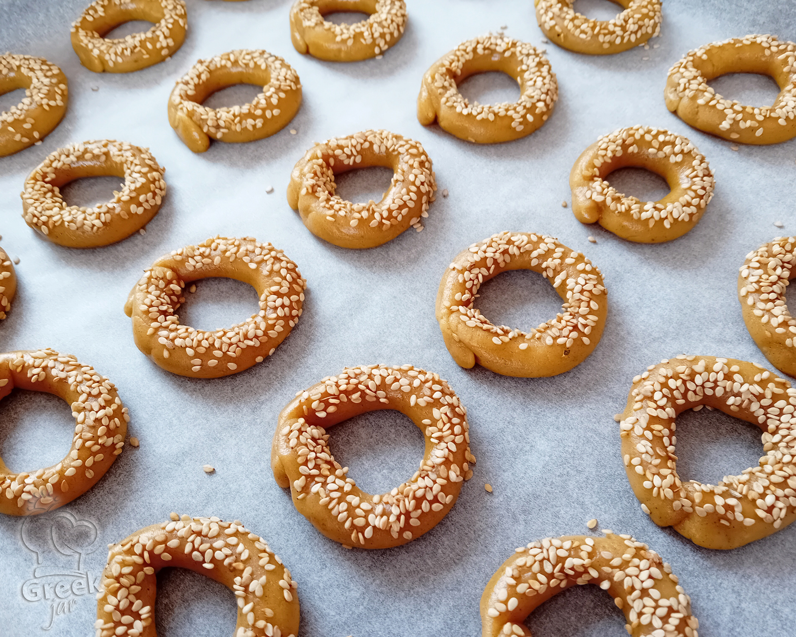 6. Εάν θέλουμε τα κουλουράκια μας με σουσάμι, βουτάμε τη μία πλευρά τους σε σουσάμι και μεταφέρουμε σε ταψί με λαδόκολλα.